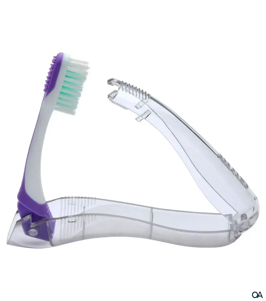 Auch unterwegs sollten Sie auf eine gründliche Mundpflege achten. Mit der GUM ORTHO Reisezahnbürste ist das auch für Zahnspangen-Träger kein Problem.