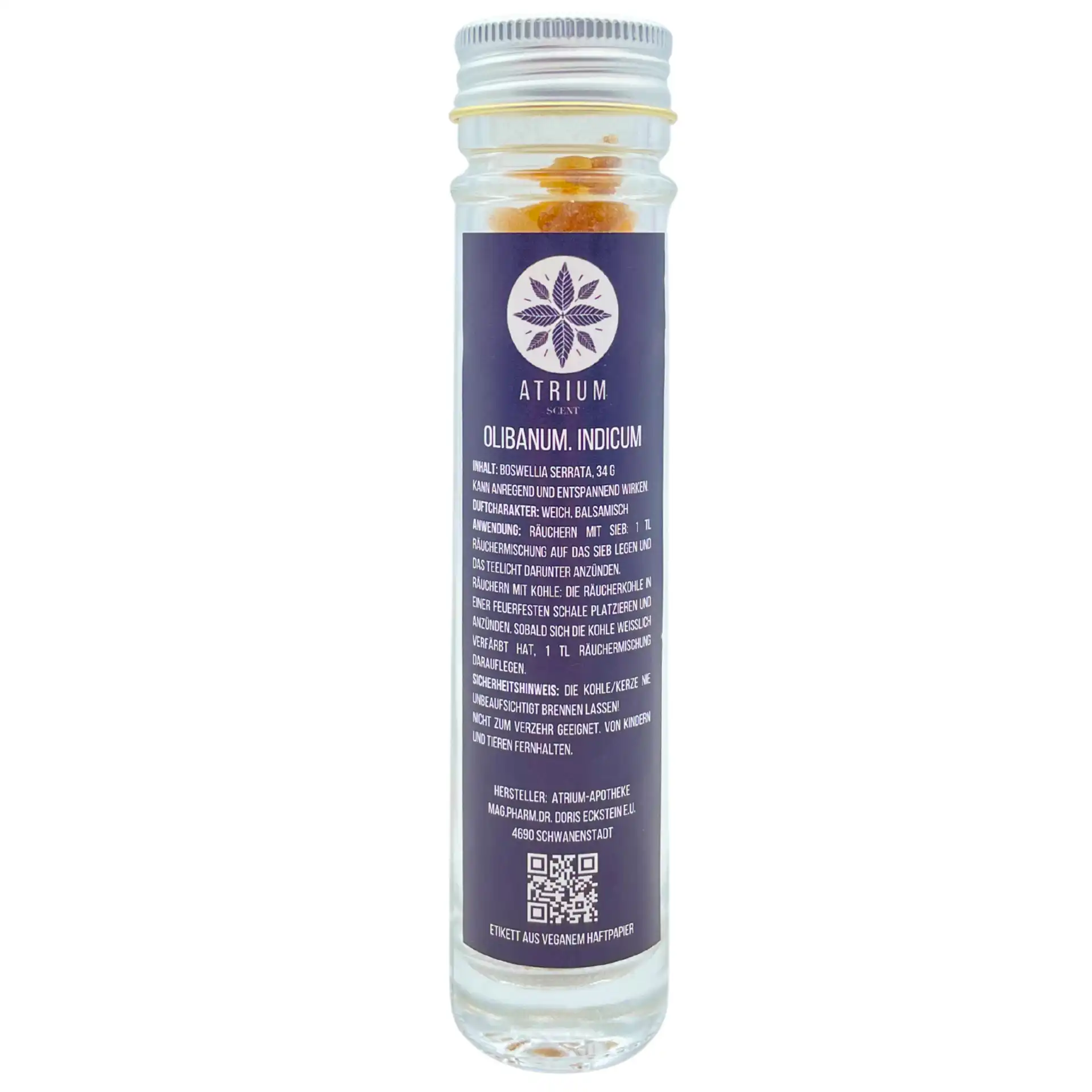 Reines Boswellia serrata Räucherharz (34 g) – aromatisch, balsamisch & entspannend. Ideal zum Räuchern mit Sieb oder Kohle. Hochwertige Qualität.ATRIUM SCENT Olibanum Indicum ist ein edles Räucherharz des indischen Weihrauchbaums Boswellia serrata. Es entfaltet einen balsamisch-warmen, aromatischen Duft mit sanft zitrischen Noten. Der Rauch wird als entspannend, klärend und harmonisierend empfunden– ideal für Meditation, Yoga und ruhige Momente.