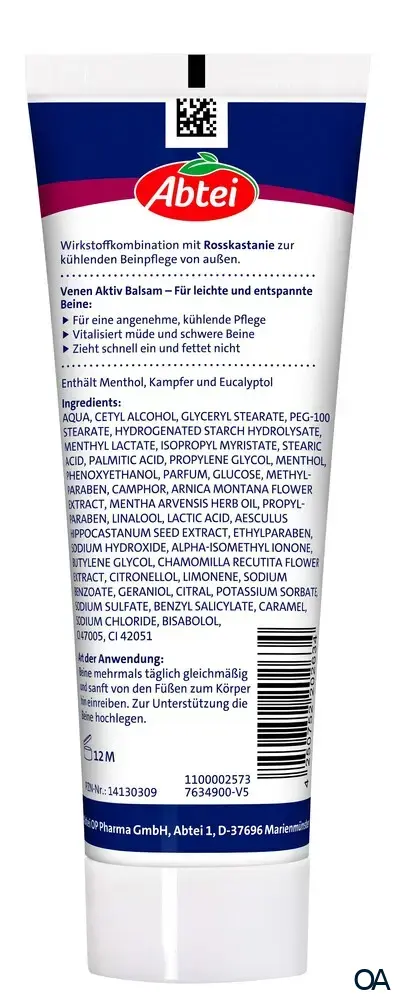 Der Balsam besteht aus einer sorgfältig zusammengestellten Kombination aus den Pflanzenextrakten der Rosskastanie, Arnika, Kamille, Menthol und Kampfer. Abtei Venen Aktiv Balsam zieht schnell ein, ohne zu fetten – für eine angenehme, erfrischende und kühlende Beinpflege.