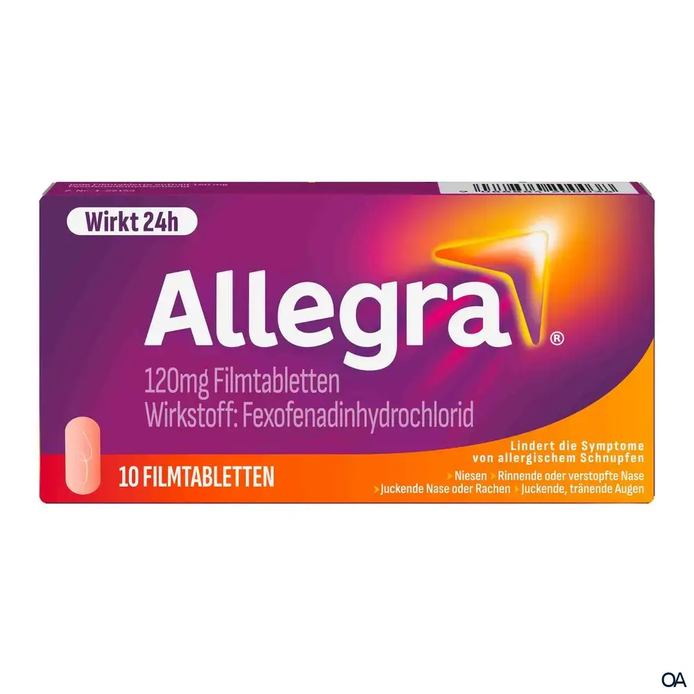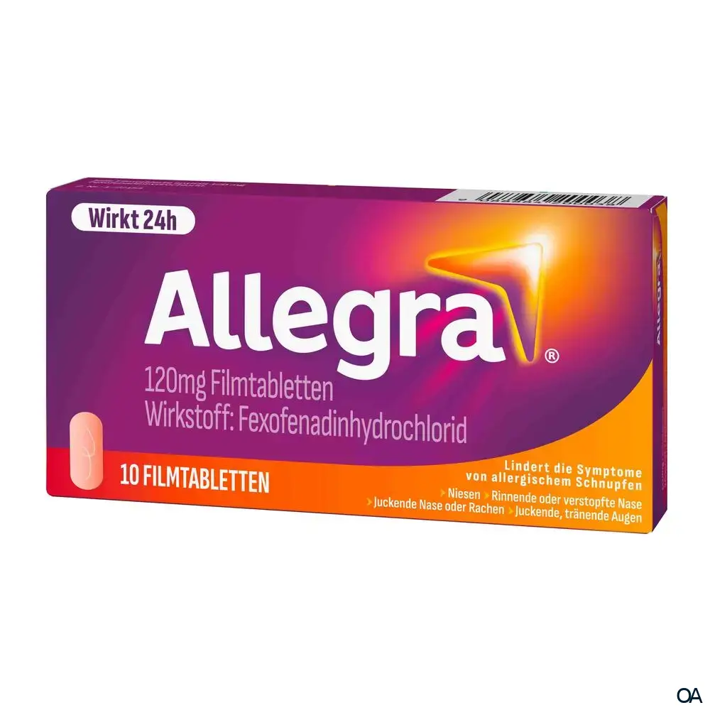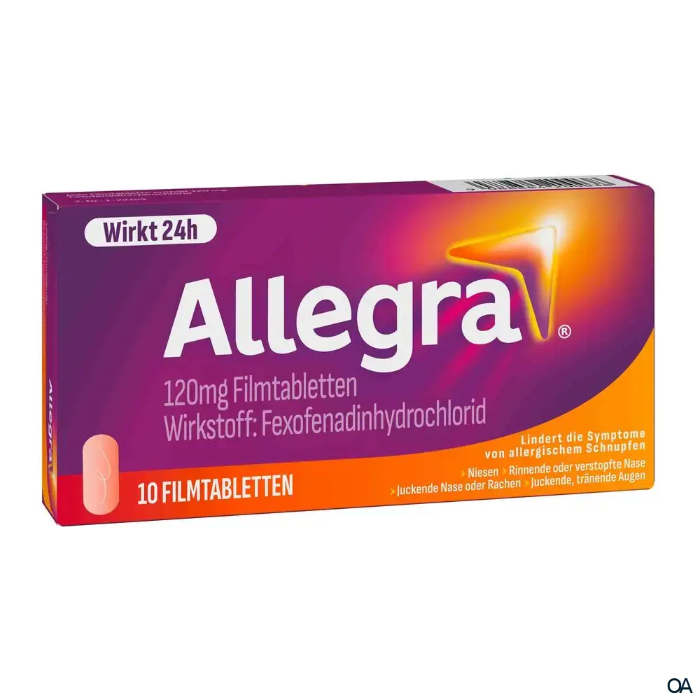 Allegra® 120 mg Filmtabletten sind ein rezeptfreies Medikament mit dem Wirkstoff - Fexofenadinhydrochlorid, zur Linderung von Allergiesymptomen wie Heuschnupfen, Niesreiz, laufende Nase und juckende Augen.Allegra® 120 mg Filmtabletten sind ein rezeptfreies Medikament mit dem Wirkstoff - Fexofenadinhydrochlorid, zur Linderung von Allergiesymptomen wie Heuschnupfen, Niesreiz, laufende Nase und juckende Augen.