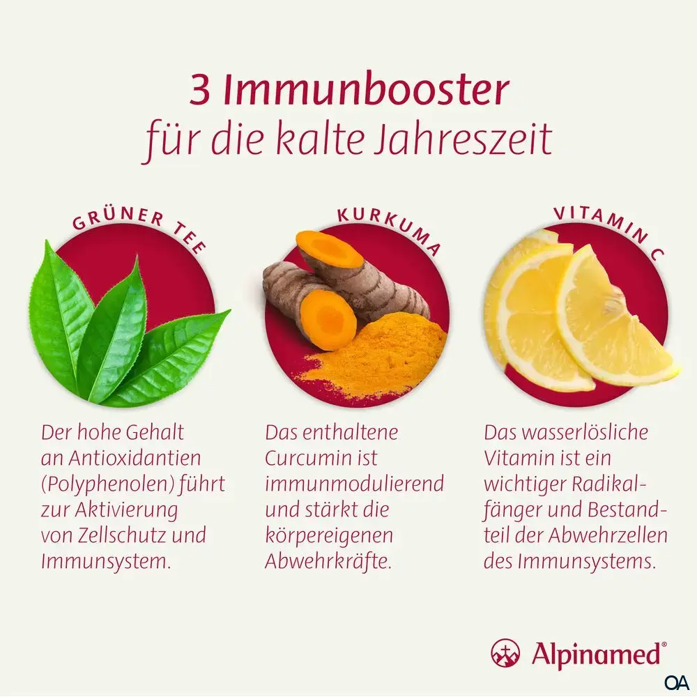 Einzigartig kombiniert mit grünem Tee, Pfeffer und Vitamin C versorgt Alpinamed® Curcuma San Immunsystem, Zellen und den Stoffwechsel mit wertvollen Pflanzenstoffen.