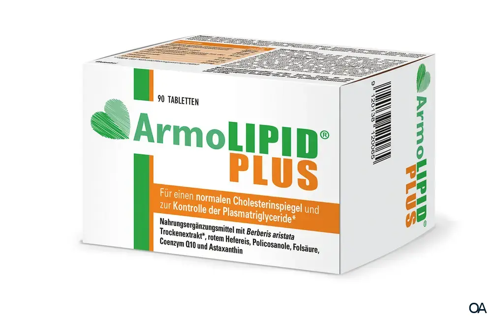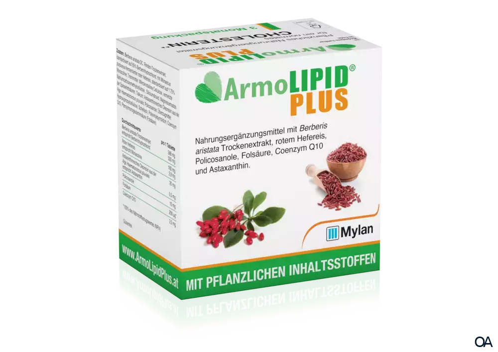 Armolipid Plus Tabletten ist ein pflanzliches Nahrungsergänzungsmittel mit Berberin in Berberis aristata Trockenextrakt, rotem Hefereis, Policosanol, Folsäure, Coenzym Q10 und Astaxanthin, für einen normalen Cholesterin- und Triglyceridspiegel im Blut..
