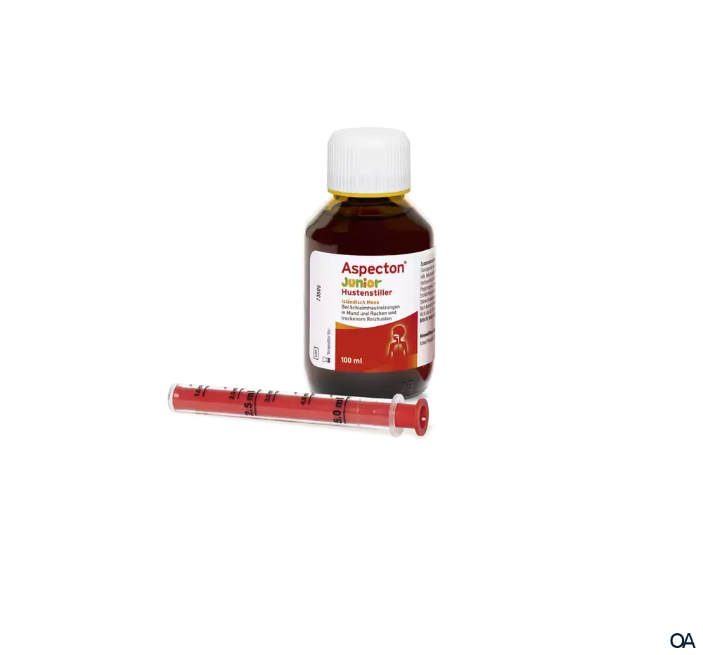 Der in Aspecton ® Junior Hustenstiller enthaltene Flüssigextrakt enthält Isländisch-Moos-Schleimstoffe, die in der Lage sind, Wasser zu binden und dadurch einen befeuchtenden Schutzfilm zu bilden. Dieser Schutzfilm hilft, den Reizhusten zu lindern und die entzündete Atemwegsschleimhaut zu beruhigen.