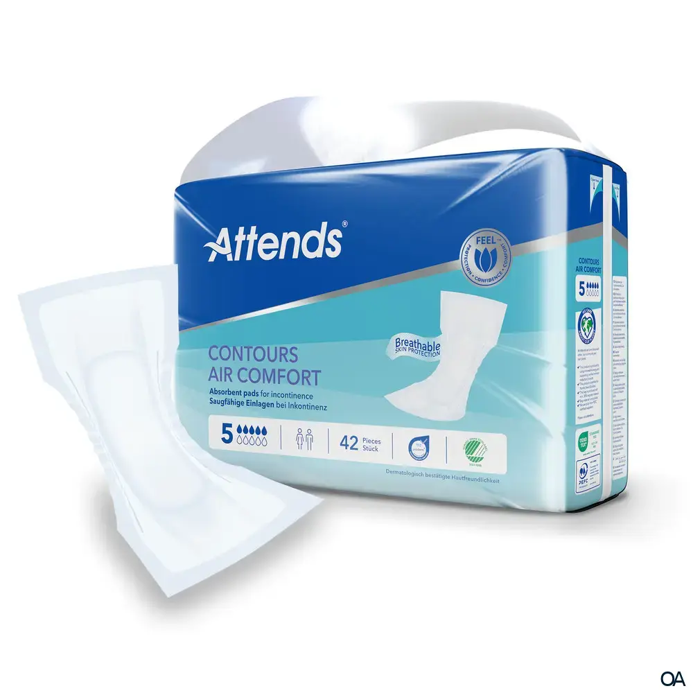 Attends Contours Air Comfort 5: Entdecken Sie die neue Generation atmungsaktiver Inkontinenz-Vorlagen mit optimaler Saugleistung für ein trockenes und sicheres Gefühl. Die anatomisch geformten Vorlagen bieten diskreten Schutz und hohen Tragekomfort.Attends Contours Air Comfort 5: Entdecken Sie die neue Generation atmungsaktiver Inkontinenz-Vorlagen mit optimaler Saugleistung für ein trockenes und sicheres Gefühl. Die anatomisch geformten Vorlagen bieten diskreten Schutz und hohen Tragekomfort.