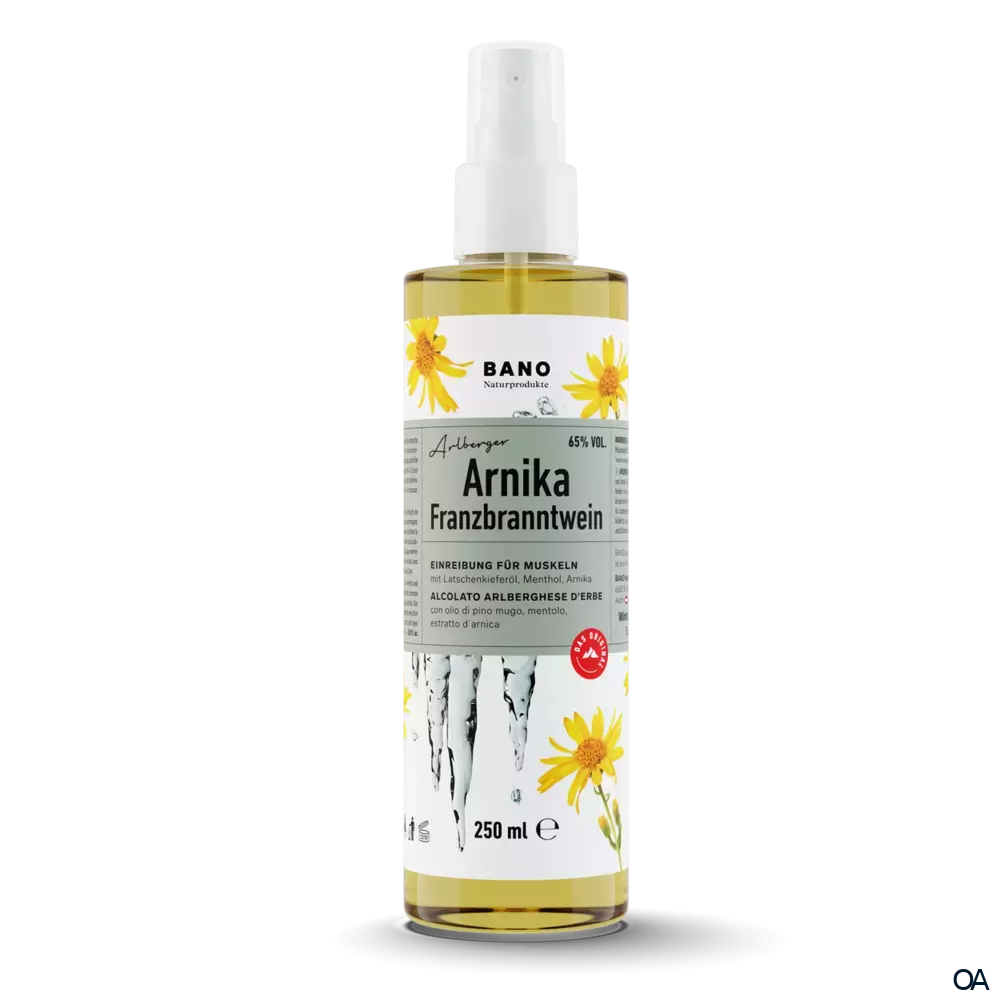 BANO Arlberger Arnika Franzbranntwein ist ideal zur Einreibung für Muskeln mit Latschenkieferöl, Menthol und Arnika. Fördert die Regeneration nach Sport und Verspannungen. Regt die Durchblutung an.BANO Arlberger Arnika Franzbranntwein ist ideal zur Einreibung für Muskeln mit Latschenkieferöl, Menthol und Arnika. Fördert die Regeneration nach Sport und Verspannungen. Regt die Durchblutung an.