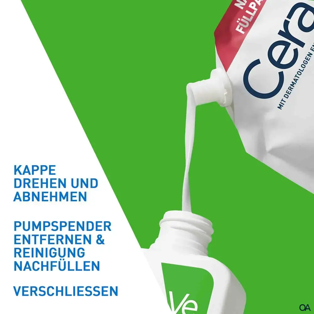 - Mithilfe des Pumpspenders die CeraVe Reinigungslotion in die Handflächen geben und auf die angefeuchtete Haut von Gesicht oder Körper auftragen. Die Reinigungslotion mit den Händen leicht einmassieren und anschließend gründlich mit klarem Wasser abspülen.