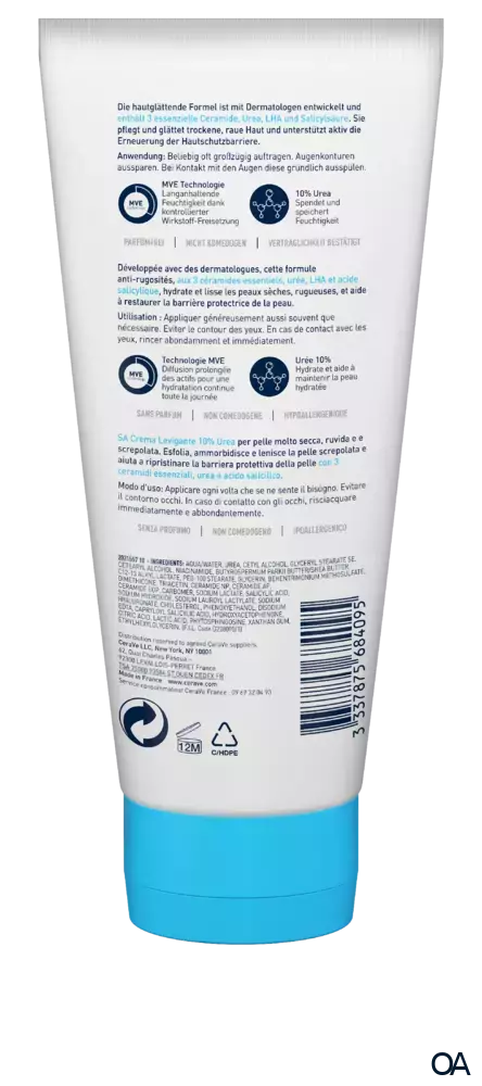 Die SA Urea Glättende Feuchtigkeitscreme ist mit Dermatologen entwickelt, parfümfrei, nicht komedogen und ihr Verträglichkeit ist bestätigt. Die SA Urea Glättende Feuchtigkeitscreme mit 10% Urea wurde mit Dermatologen für trockene, raue oder unebene Haut entwickelt. Die Feuchtigkeitspflege spendet der Körperhaut intensiv und langanhaltend Feuchtigkeit, glättet effektiv und stellt gleichzeitig die Hautschutzbarriere wieder her. Auch für zu Reibeisenhaut neigende Haut geeignet.
