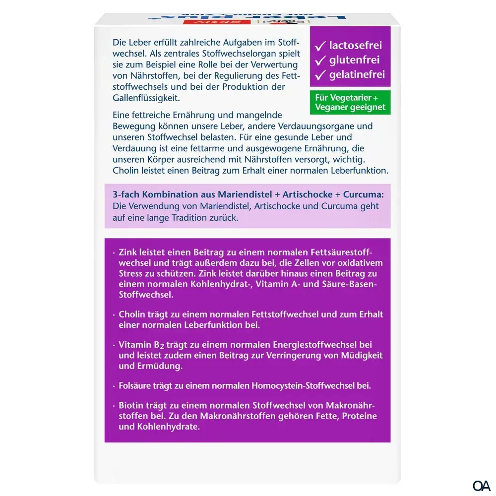 - Zusammensetzung pro Tagesdosis (1 Kapsel) %NRV*: Artischockenextrakt 50 mg **, Mariendistelextrakt 100 mg **, Curcumawurzelextrakt 100 mg **, Cholin 100 mg **, Biotin 50 µg 100 %, Folsäure 75 µg 37 %, Vitamin B2 1,4 mg 100 %, Zink 2,5 mg 25 %. * Nährstoffbezugswerte gemäß EU-Verordnung 1169/2011. ** Keine Nährstoffbezugswerte vorhanden.