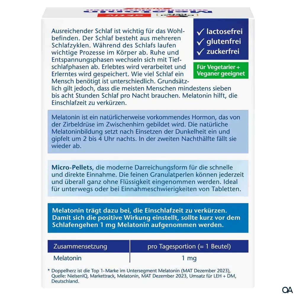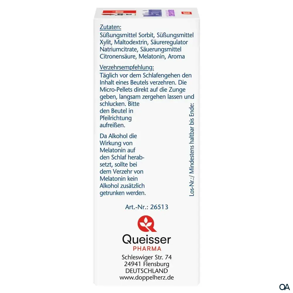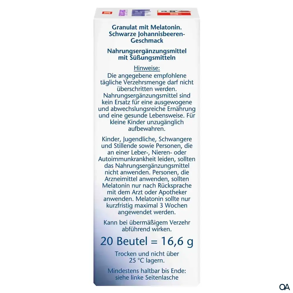 - Zusammensetzung pro Tagesdosis (1 Beutel): Melatonin 1 mg.