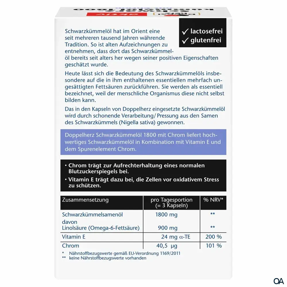 Die Doppelherz aktiv Schwarzkümmelöl 1800 mit Chrom Kapseln sind ein Nahrungsergänzungsmittel mit Schwarzkümmelsamenöl, Vitamin E und Chrom.Die Doppelherz aktiv Schwarzkümmelöl 1800 mit Chrom Kapseln sind ein Nahrungsergänzungsmittel mit Schwarzkümmelsamenöl, Vitamin E und Chrom.