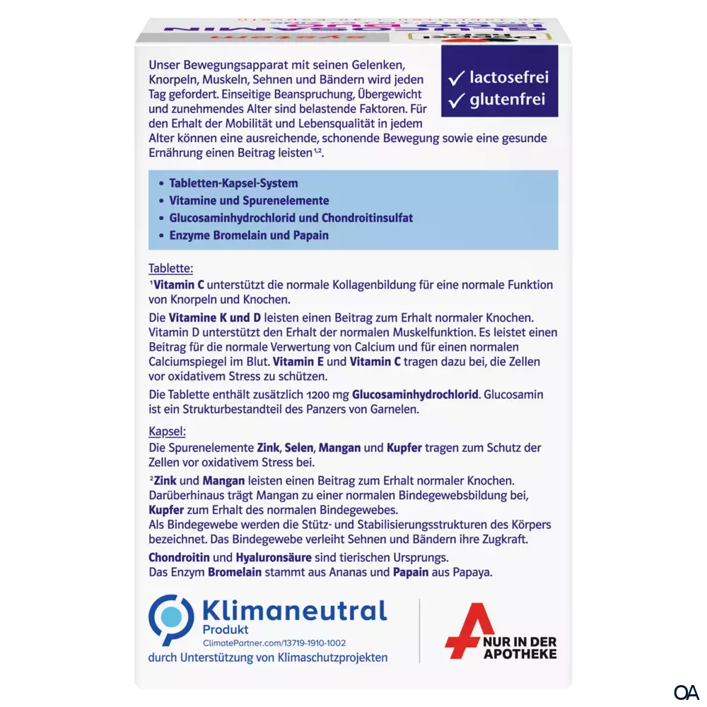 - Zusammensetzung pro Kapsel + Tablette % NRV*: Vitamin C 80 mg 100 %, Vitamin D 20 µg 400 %, Vitamin K 40 µg 53 %, Vitamin E 3 mg alpha-TE 25 %, Zink 5 mg 50 %, Mangan 1 mg 50 %, Kupfer 0,3 mg 30 %, Selen 30 µg 55 %, Glucosaminhydrochlorid 1200 mg **, Chondroitinsulfat 200 mg **, Hyaluronsäure 50 mg **, Bromelain 70 mg **, Papain 35 mg **. * Nährstoffbezugswerte gemäß EU-Verordnung 1169/2011 ** Keine Nährstoffbezugswerte vorhanden.