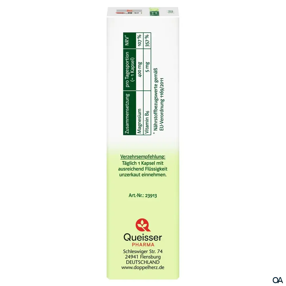 - Zusammensetzung pro Tagesdosis (1 Kapsel) %NRV*: Magnesium 400 mg 107 %, Vitamin B6 5 mg 357 %. * Nährstoffbezugswerte gemäß EU-Verordnung 1169/2011.