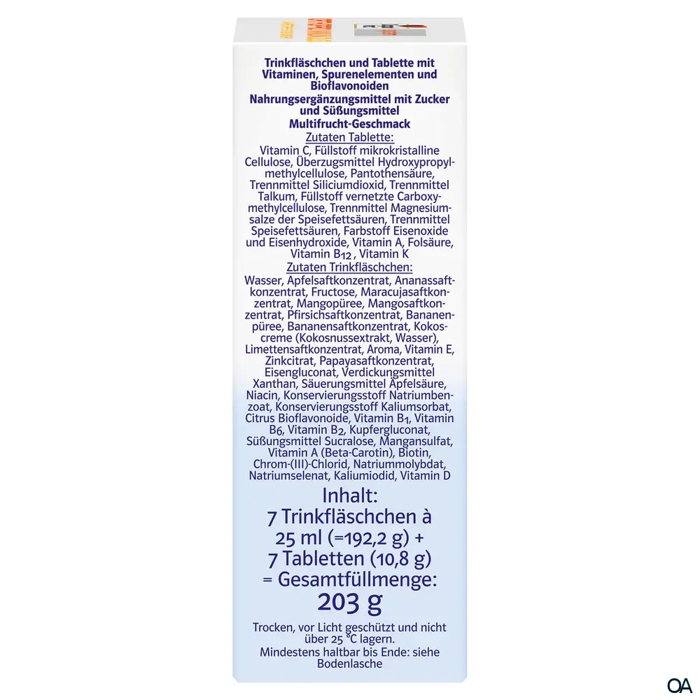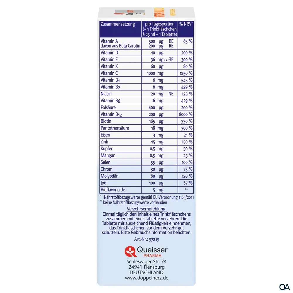 - Zusammensetzung pro Tagesdosis (1 Trinkfläschchen + 1 Tablette) %NRV*: Vitamin A 500 µg RE 63 % davon aus Beta-Carotin 200 µg RE, Vitamin D 10 µg 200 %, Vitamin E 36 mg α-TE 300 %, Vitamin K 60 µg 80 %, Vitamin C 1 000 mg 1 250 %, Vitamin B1 6 mg 545 %, Vitamin B2 6 mg 429 %, Niacin 20 mg NE 125 %, Vitamin B6 6 mg 429 %, Folsäure 400 µg 200 %, Vitamin B12 200 µg 8 000 %, Biotin 165 µg 330 %, Pantothensäure 18 mg 300 %, Eisen 3 mg 21 %, Zink 15 mg 150 %, Jod 100 µg 67 %, Kupfer 0,5 mg 50 %, Mangan 0,5 mg 25 %, Chrom 30 µg 75 %, Molybdän 60 µg 120 %, Selen 55 µg 100 %, Bioflavonoide 5 mg **. * Nährstoffbezugswerte gemäß EU-Verordnung 1169/2011. ** Keine Nährstoffbezugswerte vorhanden.