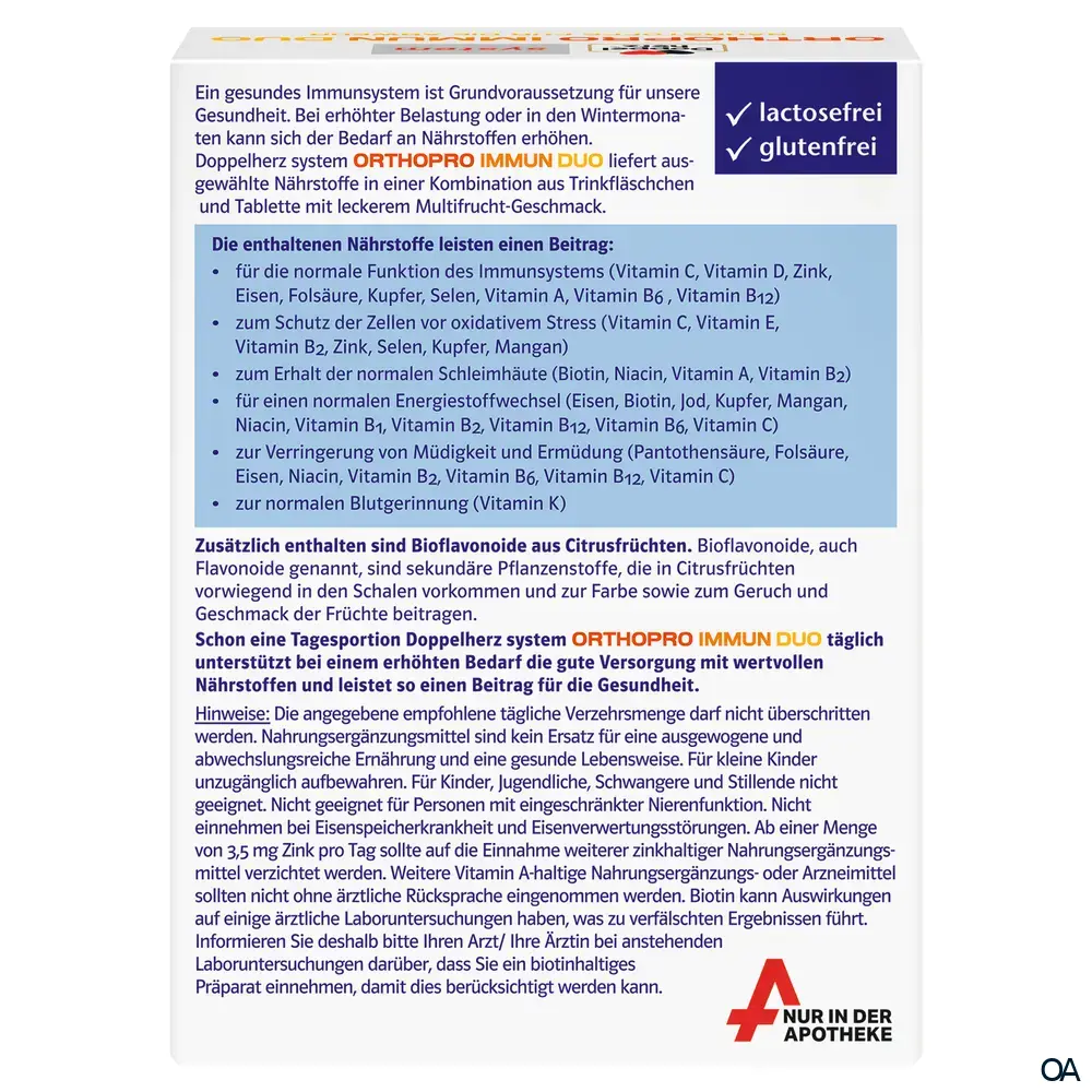 Doppelherz system ORTHOPRO IMMUN DUO liefert ausgewählte Nährstoffe in einer Kombination aus Tablette und Trinkfläschchen mit leckerem Mulitfrucht-Geschmack. Eine Tagesportion enthält unter anderem Vitamin C (1000 mg), Vitamin D (10 µg), Selen (55 µg) sowie Zink (15 mg).