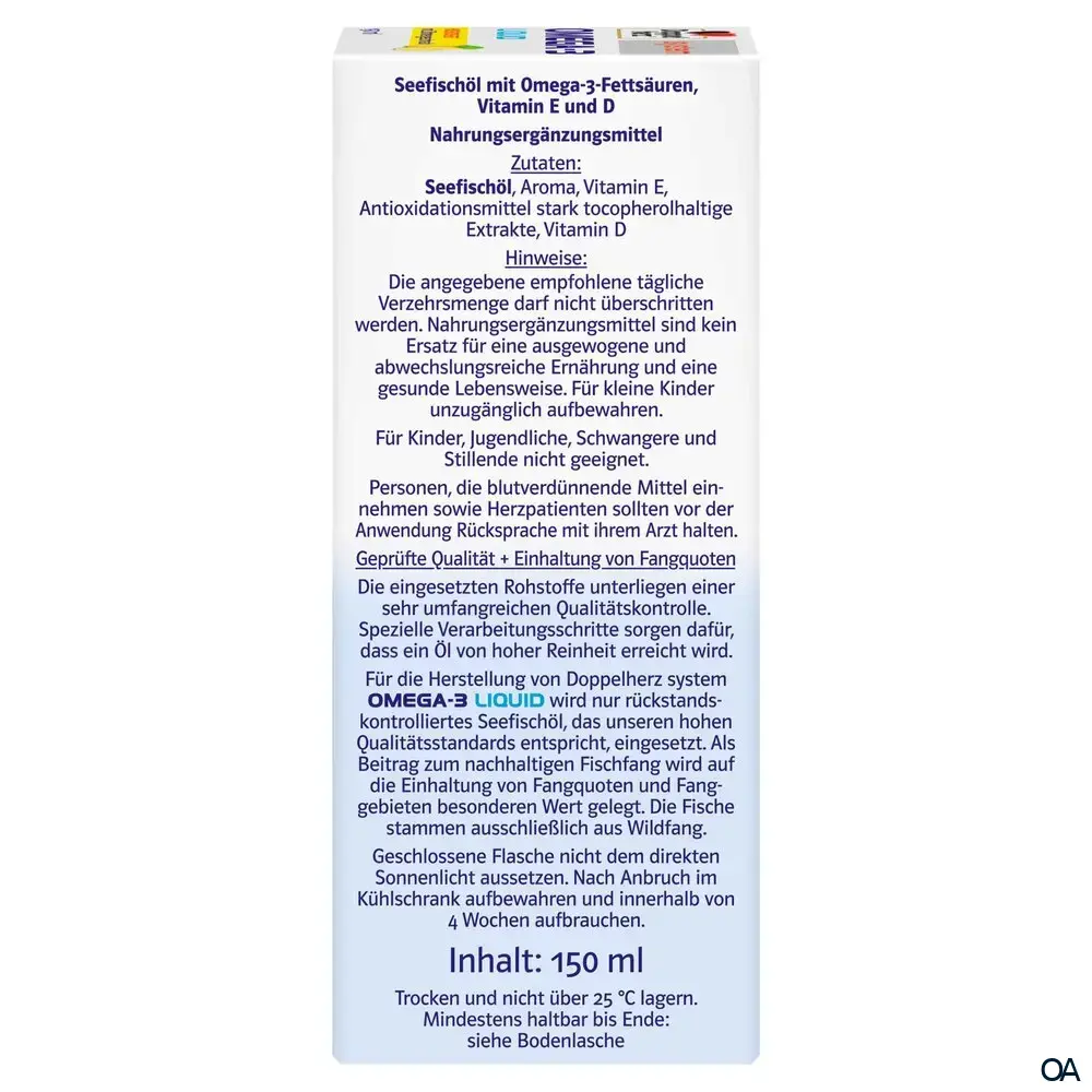- Gesund kombiniert - Doppelherz system OMEGA-3 LIQUID liefert pro Tagesmenge 2.200 mg Omega-3-Fettsäuren aus wertvollem Fischöl in Kombination mit 20 µg Vitamin D3 und 6 mg Vitamin E.