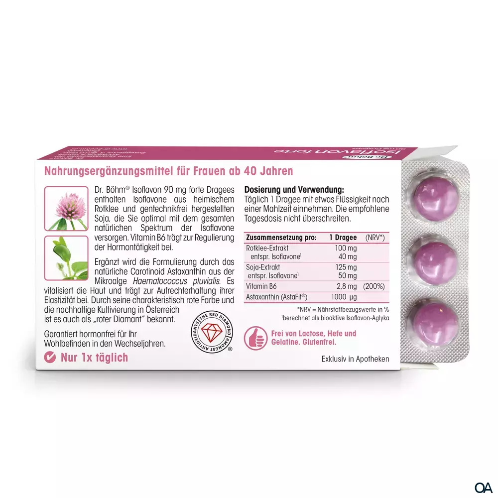 Dr. Böhm® Isoflavon forte 90 mg Dragees sind ein Nahrungsergänzungsmittel für eine hormonelle Balance für die Frau ab 40! Wohlbefinden in den Wechseljahren. Regulierung der Hormontätigkeit mit Vitamin B6 plus Astaxanthin für die Hautelastizität.Dr. Böhm® Isoflavon forte 90 mg Dragees sind ein Nahrungsergänzungsmittel für eine hormonelle Balance für die Frau ab 40! Wohlbefinden in den Wechseljahren. Regulierung der Hormontätigkeit mit Vitamin B6 plus Astaxanthin für die Hautelastizität.