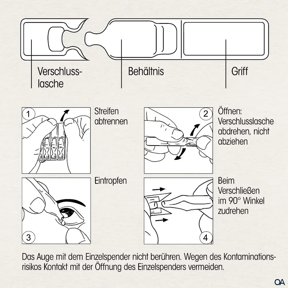 - Zum Öffnen des sterilisierten Einzelspenders drehen (nicht ziehen!) Sie den oberen Verschlussteil des Behältnisses ab. Beugen Sie den Kopf leicht nach hinten, blicken Sie nach oben und ziehen Sie das Unterlid etwas vom Auge weg. Durch leichten Druck auf den oberen Teil des Spenders tropfen Sie einen Tropfen in den unteren Bindehautsack. Vermeiden Sie jegliche Berührung der Tropföffnung mit dem Auge. Die gelartige Flüssigkeit bildet einen natürlichen Schutzfilm, der sich nach mehrmaligem Blinzeln – auch bei Kontaktlinsenträgern – gleichmäßig verteilt.