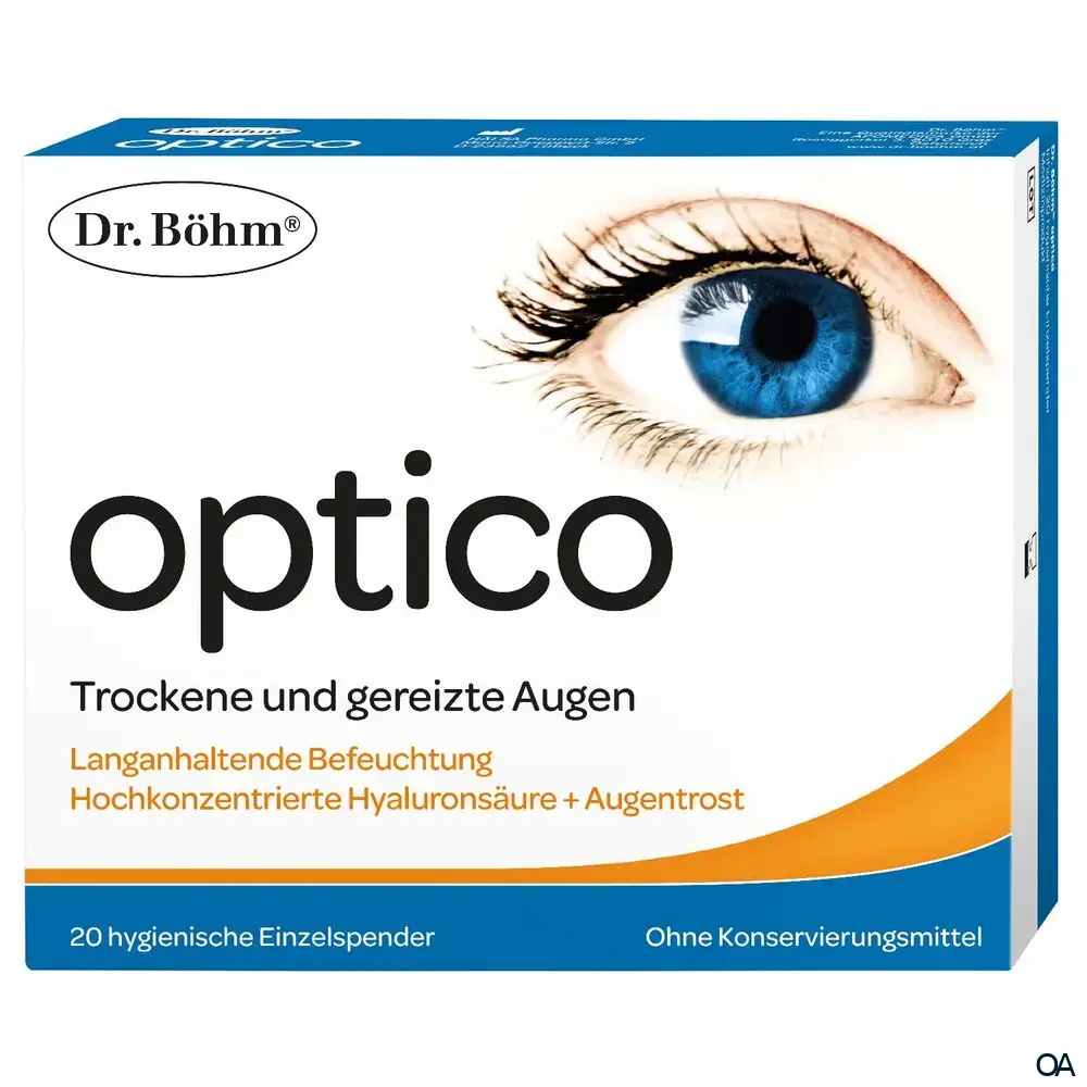 Dr. Böhm® optico Augentropfen für trockene und gereizte Augen, ideal für unterwegs! Langanhaltendende Befeuchtung dank hochkonzentriertem Hyaluronat und Augentrost.Dr. Böhm® optico Augentropfen für trockene und gereizte Augen, ideal für unterwegs! Langanhaltendende Befeuchtung dank hochkonzentriertem Hyaluronat und Augentrost.