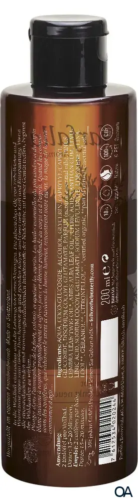 Zusammensetzung: AQUA, COCO-GLUCOSIDE, ALCOHOL, GLYCERIN, CAPRYLYL/CAPRYL GLUCOSIDE, DISODIUM COCOYL GLUTAMATE, PARFUM (natural essential oils), PINUS CEMBRA LEAF/TWIG OIL*, ABIES ALBA LEAF OIL*, CITRIC ACID, XANTHAN GUM, LEVULINIC ACID, SODIUM COCOYL GLUTAMATE, SODIUM LEVULINATE, LIMONENE**, LINALOOL**, GERANIOL**, CITRONELLOL**. *certified organic, **part of natural essential oils.