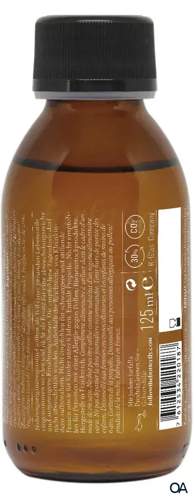 - Morgens & abends je 10ml (= 2 TL) unverdünnt einnehmen. Bis 30 Tage nach dem Öffnen konsumieren und bei Raumtemperatur aufbewahren. Nahrungsergänzungsmittel sollten als Teil eines gesunden Lebensstils eingenommen werden und nicht als Ersatz für eine abwechslungsreiche und ausgewogene Ernährung dienen. Die empfohlene Tagesdosis darf nicht überschritten werden. Außerhalb der Reichweite von Kleinkindern aufbewahren. Nicht empfohlen für schwangere und stillende Frauen sowie für Kinder unter 6 Jahren. Enthält Propolis. Nicht empfohlen für Personen mit einer Allergie gegen Pollen/Bienenstockprodukte.