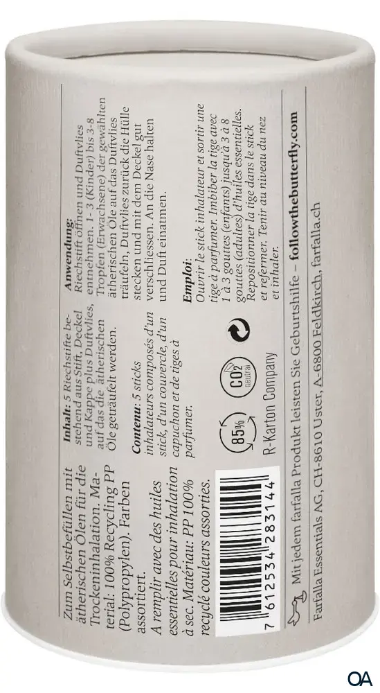 Entdecken Sie das praktische Farfalla Riechstiftset mit 5 belebenden Farben. Ideal für Aromatherapie unterwegs. Zum Selbstbefüllen mit ätherischen Ölen für die Trockeninhalation.Entdecken Sie das praktische Farfalla Riechstiftset mit 5 belebenden Farben. Ideal für Aromatherapie unterwegs. Zum Selbstbefüllen mit ätherischen Ölen für die Trockeninhalation.