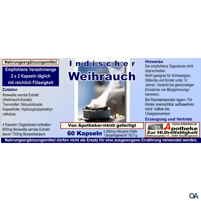 - Zutaten: Boswellia serrata Extrakt (Weihrauch Extrakt), Trennmittel: Siliciumdioxide, Kapselhülle: Hydroxypropylmethylcellulose.
