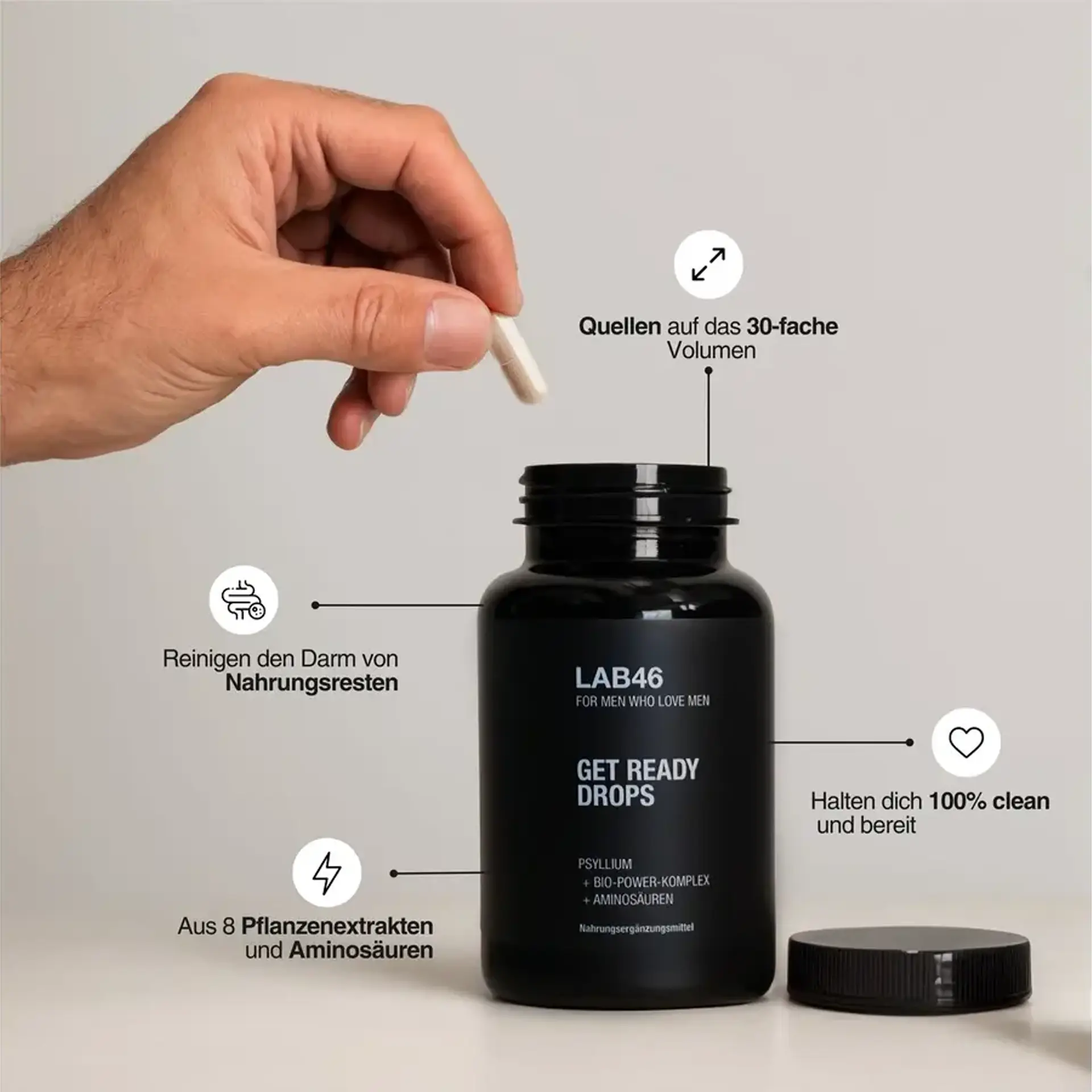 Die ballaststoffreichen Get Ready Drops von Lab46® sind dein Geheimtipp für eine gesunde Verdauung – und für mehr Spontanität im Liebesleben. Dank ihres enormen Quellvermögens (bis zum 30-fachen des Eigenvolumens) binden sie überschüssige Flüssigkeit und Nahrungsreste und sorgen für eine saubere, rückstandslose Entleerung.