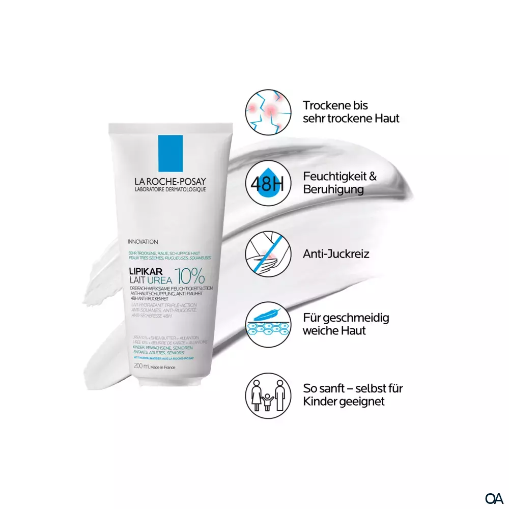 Die LIPIKAR Lait Urea 10 % ist die optimale Feuchtigkeitslotion für sehr trockene, raue und schuppige Haut. Dank ihrem Wirkstoffkomplex aus 10% Urea, HEPES und Sheabutter wird die die Haut bis zu 48 Stunden lang mit intensiver Feuchtigkeit versorgt. Gleichzeitig hat die Urea Creme eine beruhigende Wirkung und stärkt die Hautschutzbarriere effektiv. Die La Roche Posay Körperlotion mit 10 % Urea ist so sanft formuliert, dass sie für Erwachsene, Senioren und selbst für Kinder mit empfindlicher Haut ideal geeignet ist. Auch bei zu Xerosis neigender Haut sorgt die Bodylotion für eine weichere, hydratisierte Haut.