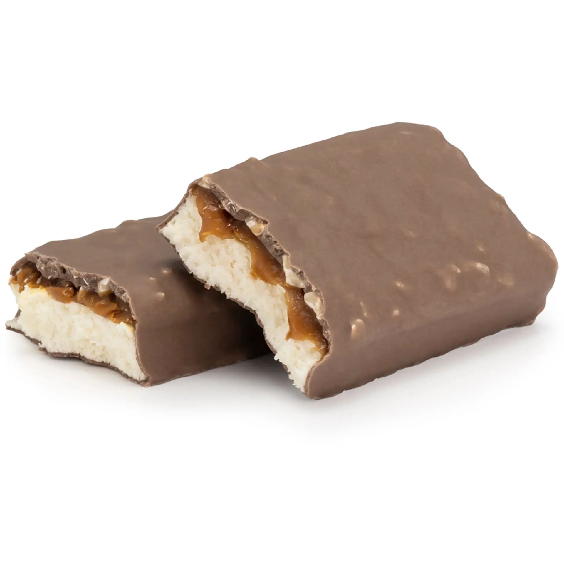 Proteinmischung 33 % (Milchproteinkonzentrat, hydrolysierte Kollagenpeptide 11 %, Vollmilchpulver), Milchüberzug mit Maltit und Protein 22 % (Süßungsmittel: Maltit, vollständig gehärtetes Raps- und Kokosöl, Milchproteinkonzentrat, Magermilchpulver, Kakaopulver, Emulgator: Lecithine, Aroma), Paste mit Karamellgeschmack 14 % (Fructooligosaccharide, Vollmilchpulver, Wasser, Kakaobutter, Sonnenblumenöl, Feuchthaltemittel: Glycerin, Aroma, Emulgator: Lecithine, Speisesalz), Süßungsmittel: Maltit, Feuchthaltemittel: Glycerin, Sojaprotein-Extrudat 5 % (Sojaprotein, Tapiokastärke, Speisesalz), Rapsöl, Wasser, Speisesalz 0,5 %, Aromen, Verdickungsmittel: Akaziengummi, Emulgator: Mono- und Diglyceride von Speisefettsäuren, Antioxidationsmittel: tocopherolreicher Extrakt.