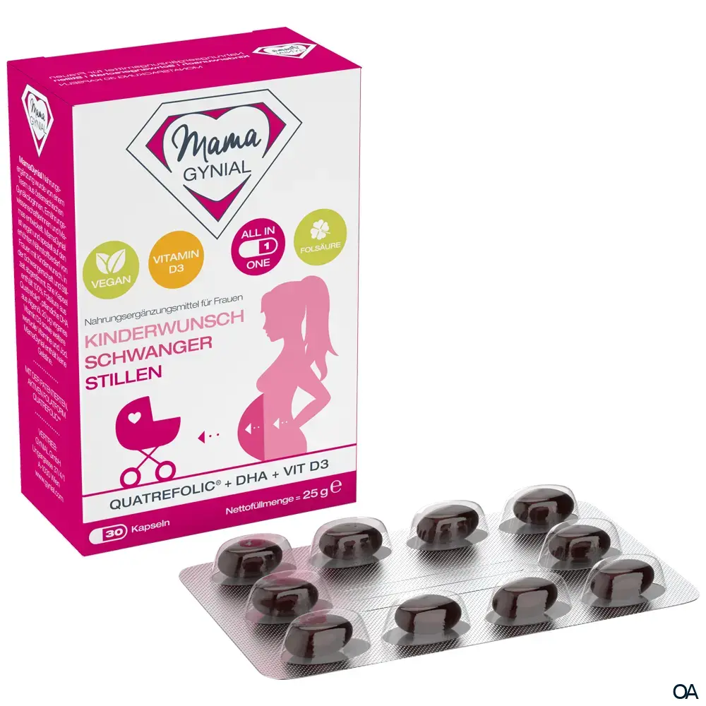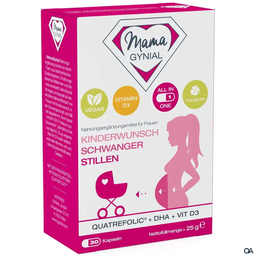 MamaGynial wurde gemeinsam mit österreichischen Frauenärztinnen, Ernährungsexperten und Mamas entwickelt, um Frauen in diesen Lebensphasen optimal zu versorgen. Nur 1 Kapsel MamaGynial täglich deckt Ihren Mehrbedarf an Folsäure (Folat), DHA (Omega-3-Fettsäure), Vitamin D3 und anderen Mikronährstoffen.