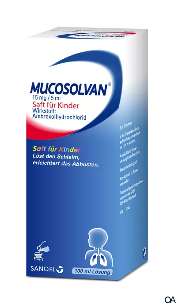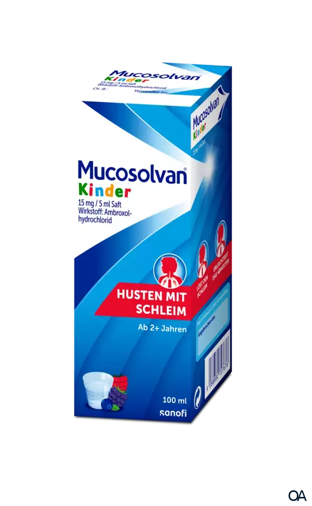 Mucosolvan® Kinder 15 mg / 5 ml Saft ist ein wirksamer Schleimlöser für Kinder ab 2 Jahren. Er löst gestautes und zäh haftendes Sekret von der Bronchialwand und erleichtert das Abhusten. Mucosolvan® Kinder Saft ist gut verträglich und alkoholfrei.Mucosolvan® Saft für Kinder ist ein Arzneimittel mit dem Wirkstoff Ambroxolhydrochlorid. Wirkt sicher und zuverlässig gegen zähen Hustenschleim und schmeckt angenehm-fruchtigen nach Waldbeer-Vanille.