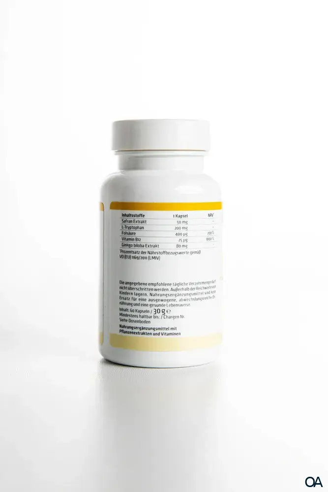 - Zusammensetzung pro Tagesdosis (1 Kapsel) %NRV*: Safran Extrakt 50mg –, L-Tryptophan 200mg –, Folsäure 400µg 200%, Vitamin B12 25µg 1000%, Ginkgo biloba Extrakt 80mg –. * NRV = Nutrient Reference Value, Nährstoffbezugswert.