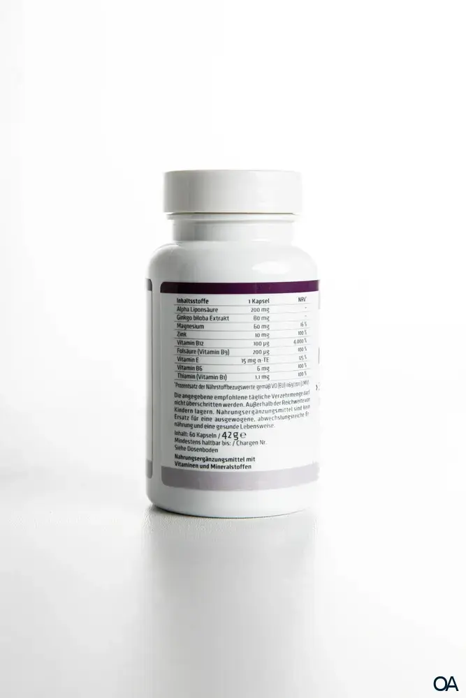 - Zusammensetzung pro Tagesdosis (1 Kapsel) %NRV*: Alpha-Liponsäure 200,0mg –, Ginkgo-biloba-Extrakt 80,0mg –, Magnesium 60,0mg 16%, Zink 10,0mg 100%, Vitamin B12 100µg 4.000%, Folsäure (Vitamin B9) 200µg 100%, Vitamin E 15,0mg 125%, Vitamin B6 6,0mg 100%, Thiamin (Vitamin B1) 1,1mg 100%. * NRV = Nutrient Reference Value, Nährstoffbezugswert.