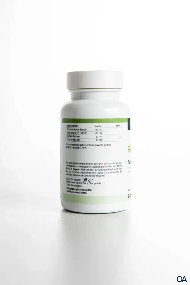 - Zutaten: Füllstoff: Cellulose, Hydroxypropylmethylcellulose (Kapselhülle), Passionsblume Extrakt, Baldrianwurzel Extrakt, Melissen Extrakt, Hopfen Extrakt.
