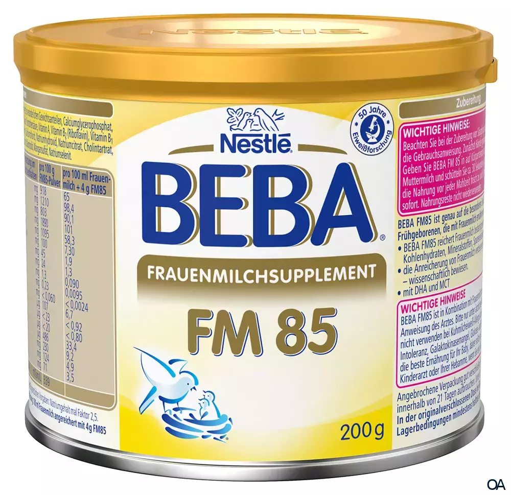 - Nestlé BEBA FM85 ist in Kombination mit Frauenmilch zur ausschließlichen Ernährung bestimmt. Von Geburt an nach Anweisung des Arztes. Bitte nur unter ärztlicher Aufsicht verwenden. Nicht zur parenteralen Verwendung. Bitte nicht verwenden bei Kuhmilcheiweiß-Allergie bzw. Unverträglichkeit, Galaktosämie, kongenitaler Laktose-Intoleranz, Galaktokinasemangel, Glukose- und Galaktose-Malabsorption, Maltose-Unverträglichkeit.