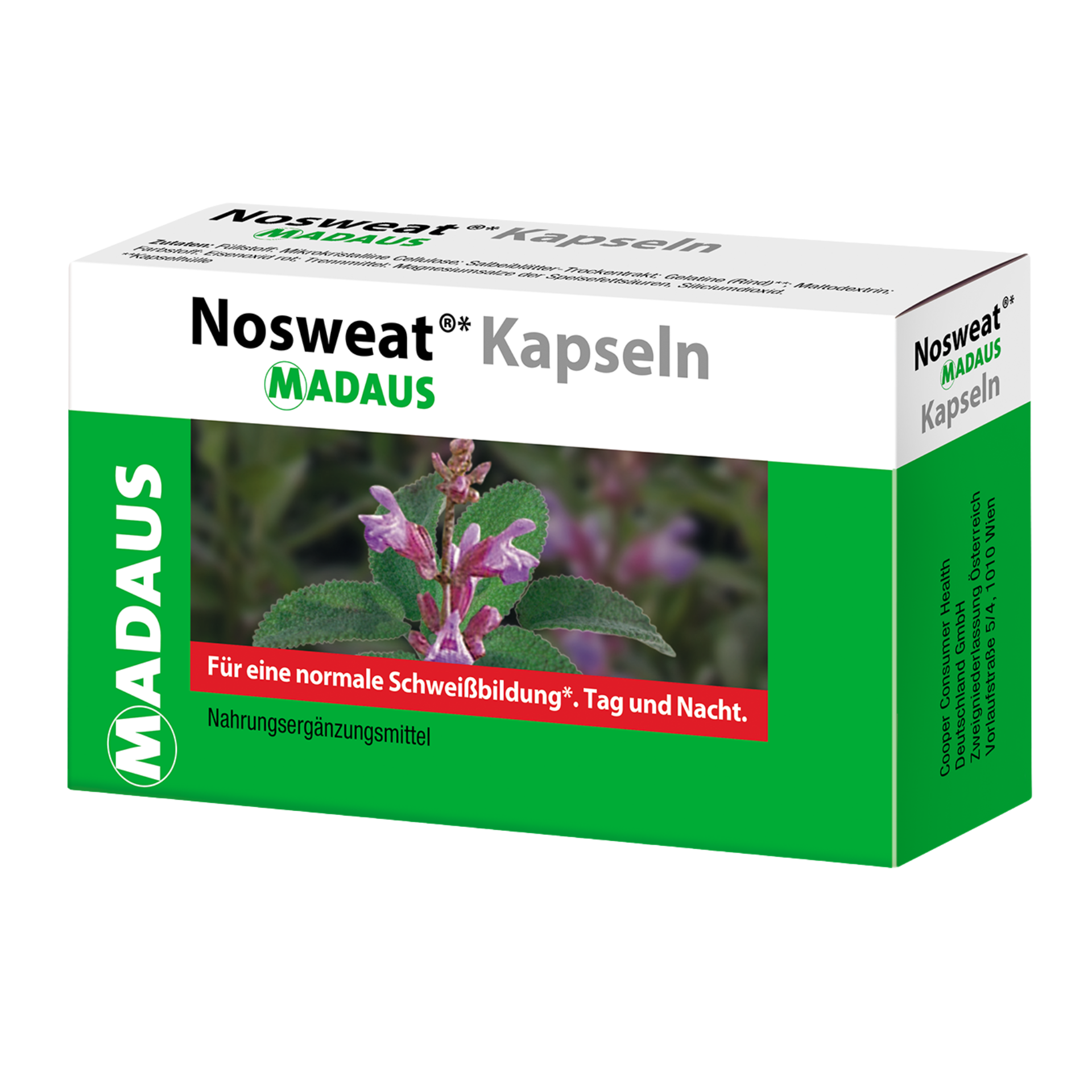 Nosweat® Madaus Kapseln sind ein Nahrungsergänzungsmittel zur Beruhigung bei übermäßiger Schweißabsonderung. Die Kapsel gegen Schwitzen, mit Salbei-Extrakt, wirkt innerhalb von 2 Stunden. Ideal in den Wechseljahren, bei Stress oder Nervosität, usw.Nosweat® Madaus Kapseln sind ein Nahrungsergänzungsmittel zur Beruhigung bei übermäßiger Schweißabsonderung. Die Kapsel gegen Schwitzen, mit Salbei-Extrakt, wirkt innerhalb von 2 Stunden. Ideal in den Wechseljahren, bei Stress oder Nervosität, usw.