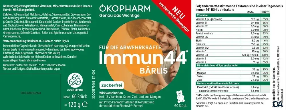 - Immun44® Bärlis sind zuckerfrei und enthalten eine durchdachte Wirkkombination mit 13 Vitaminen, Selen, Zink, Jod und Mangan.
