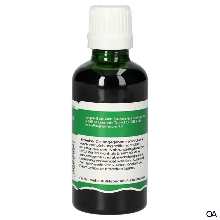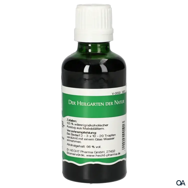 Zusammensetzung: Mateblättertropfen enthalten einen hochwertigen wässrig/alkoholischen Auszug aus Mateblättern. Der Auszug wird nach Vorgaben des Arzneibuches im Verhältnis 1:5 hergestellt. Alkoholgehalt: 66 % Vol.