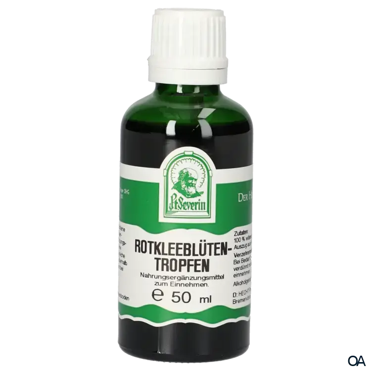 Zusammensetzung: Rotkleeblütentropfen enthalten einen hochwertigen wässrig/alkoholischen Auszug aus Rotkleeblüten. Der Auszug wird nach Vorgaben des Arzneibuches im Verhältnis 1:5 hergestellt. Alkoholgehalt: 66 % Vol.
