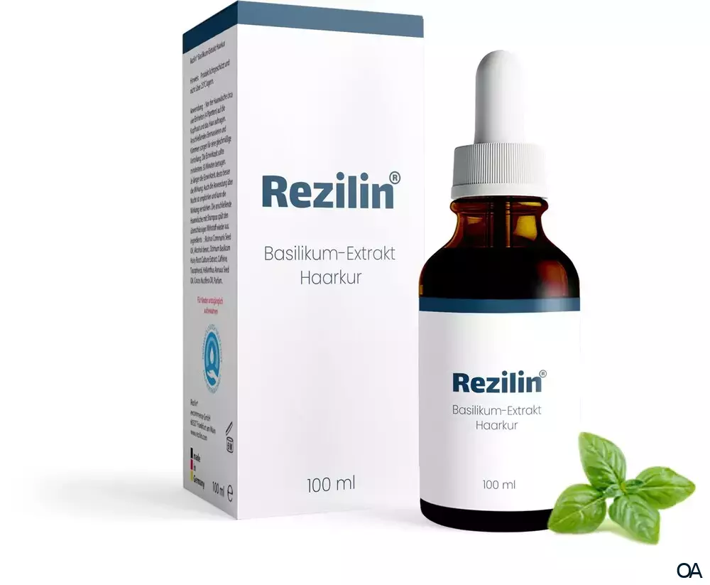 - Eine Anwendungsstudie** hat gezeigt, dass das Basilikum-Extrakt nach einer 12-wöchigen Testphase eine Verbesserung hinsichtlich der ausgefallenen Haare bei den Probanden bewirken konnte. Rezilin kombiniert diesen Wirkstoff mit reichhaltigen Ölen, die die trockene Kopfhaut und das strapazierte Haar pflegen und so Haarbruch und Haarausfall* vorbeugen können. Die pflegenden Öle sowie Aloe Vera sorgen zusätzlich für spürbar mehr Geschmeidigkeit und Glanz. Ergänzt wird die Haarkur mit Koffein.