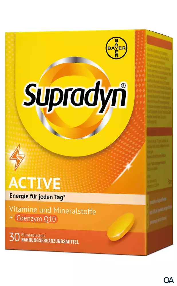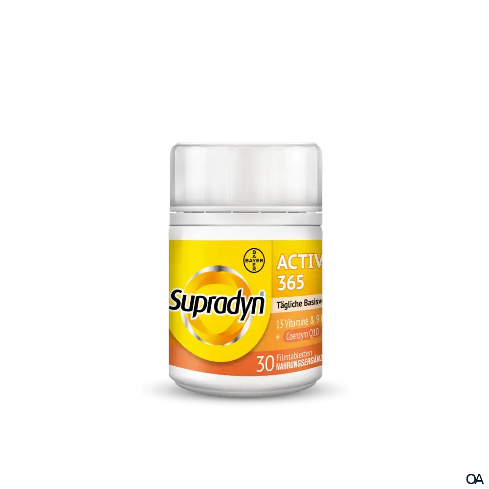 Supradyn® active 365 Filmtabletten sind ein Nahrungsergänzungsmittel mit allen 13 Vitaminen, 9 Mineralstoffen sowie Coenzym Q10. Die spezielle Dosierung versorgt den Körper mit wichtigen Vitaminen und Mineralstoffen des täglichen Bedarfs.Supradyn® active 365 Filmtabletten sind ein Nahrungsergänzungsmittel mit allen 13 Vitaminen, 9 Mineralstoffen sowie Coenzym Q10. Die spezielle Dosierung versorgt den Körper mit wichtigen Vitaminen und Mineralstoffen des täglichen Bedarfs.