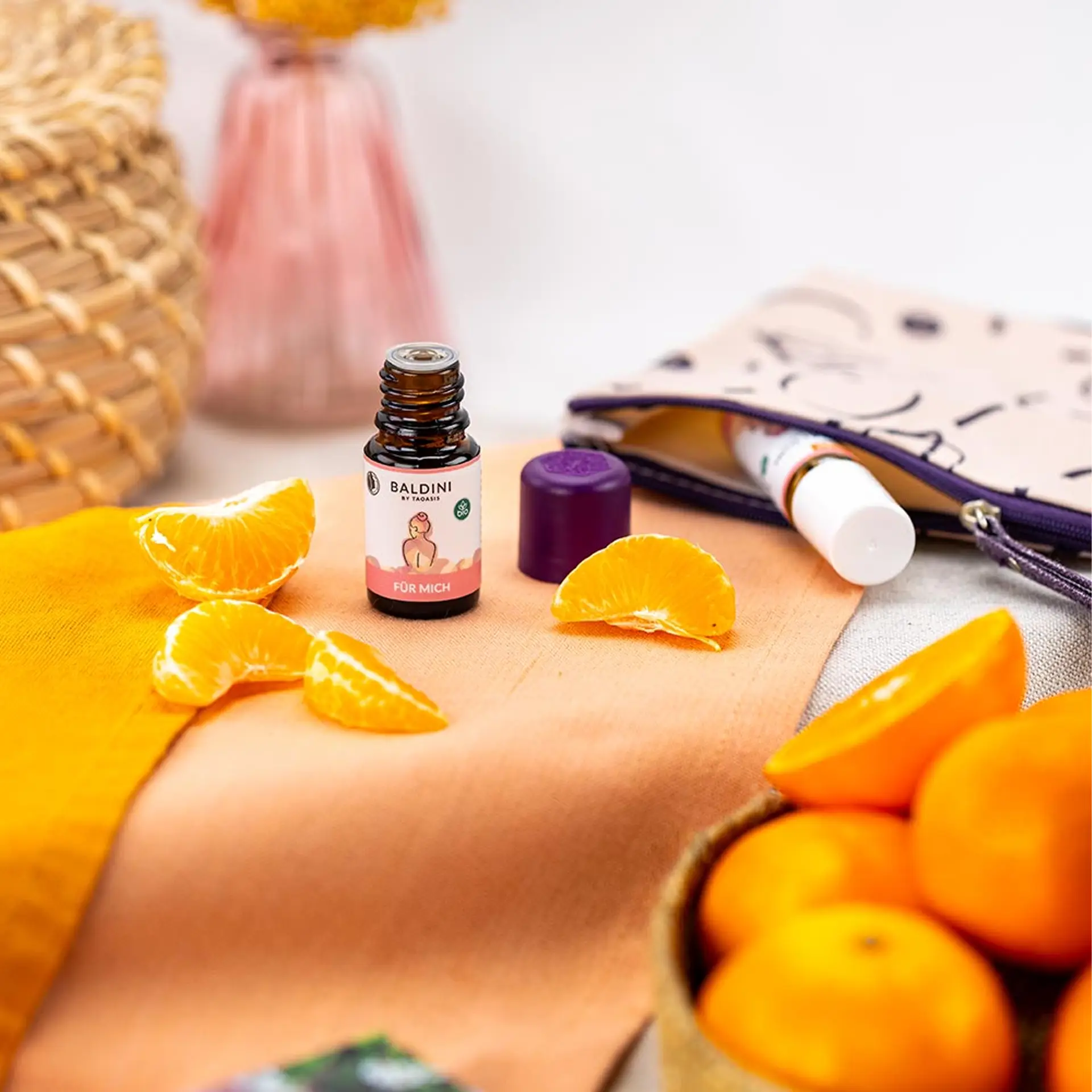 Erlebe den beruhigenden Duft von Baldini Bio-Aroma Für Mich. Eine harmonische Komposition aus Lindenblüte, Iriswurzel und Mandarine für Entspannung und Geborgenheit.Wenn Lindenblüte auf Iriswurzel und Mandarine rot trifft, entsteht ein Wohlfühlduft, der zum Abschalten und Entspannen einlädt – zart-blumig und fruchtig-frisch zugleich. Sanft wie eine Umarmung, hüllt uns die wundervolle Komposition aus 100 % naturreinen ätherischen Ölen ein, spendet Geborgenheit und Ruhe.