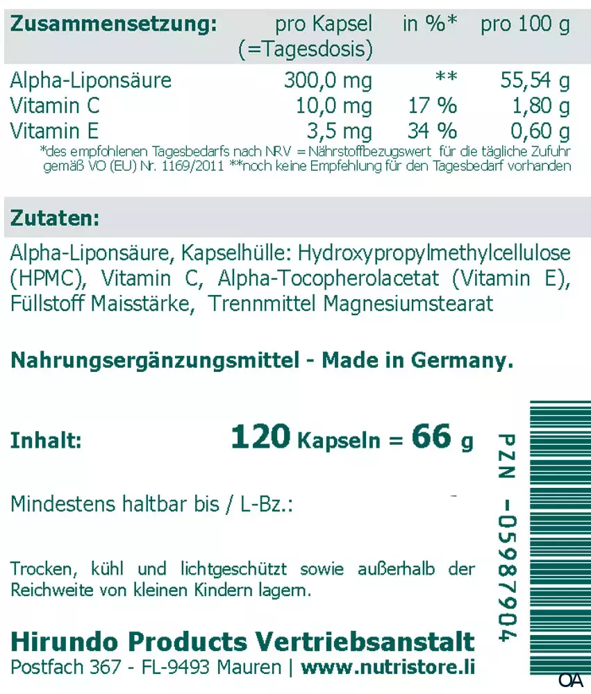 - Zutaten: Alpha-Liponsäure, Kapselhülle: Hydroxypropylmethylcellulose (HPMC), Vitamin C, Alpha-Tocopherolacetat (Vitamin E), Füllstoff Maisstärke, Trennmittel Magnesiumstearat.
