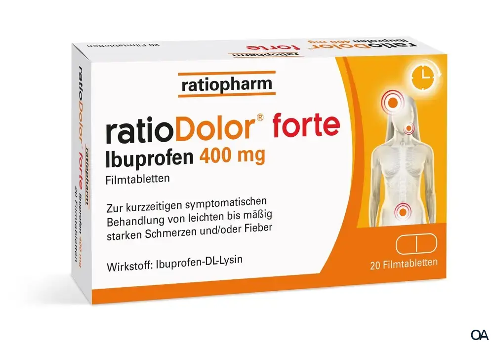 Die ratioDolor® forte Ibuprofen 400 mg Filmtabletten sind ein rezeptfreies Arzneimittel mit dem Wirkstoff: Ibuprofen. Die Tabletten dienen zur Anwendung bei Schmerzzuständen wie z.B. Kopfschmerzen, Zahnschmerzen, Muskelschmerzen, usw.Die ratioDolor® forte Ibuprofen 400 mg Filmtabletten sind ein rezeptfreies Arzneimittel mit dem Wirkstoff: Ibuprofen. Die Tabletten dienen zur Anwendung bei Schmerzzuständen wie z.B. Kopfschmerzen, Zahnschmerzen, Muskelschmerzen, usw.