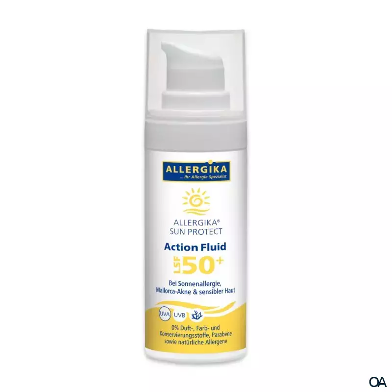 ALLERGIKA® SUN PROTECT Action Fluid SPF 50+ ist ein dermatologischer Spezial-UV-Schutz, der speziell für empfindliche und allergische Haut entwickelt wurde. Dieses hochwirksame Fluid bietet einen sehr hohen UVA- und UVB-Schutz mit Lichtschutzfaktor 50+ und verwendet riff-freundliche, nicht hormonwirksame UV-Filter. Es ist ideal zur Vorbeugung von Sonnenbrand, Sonnenallergie und Mallorca-Akne.