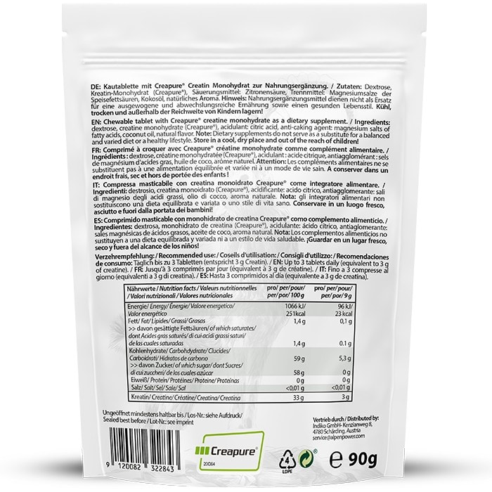 Entdecke Creapure® Premium Creatin für optimale Leistung und Regeneration. Praktische Kautabletten mit Creapure® Creatin-Monohydrat und Dextrose – ideal für unterwegs.