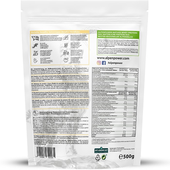 Das Whey Isolat von AlpenPower® stammt aus hochwertiger Alpenmilch von Weidekühen. Es bietet eine außergewöhnlich hohe Reinheit und schnelle Verfügbarkeit für deinen Körper – ideal für alle, die maximale Qualität und Leistung erwarten.