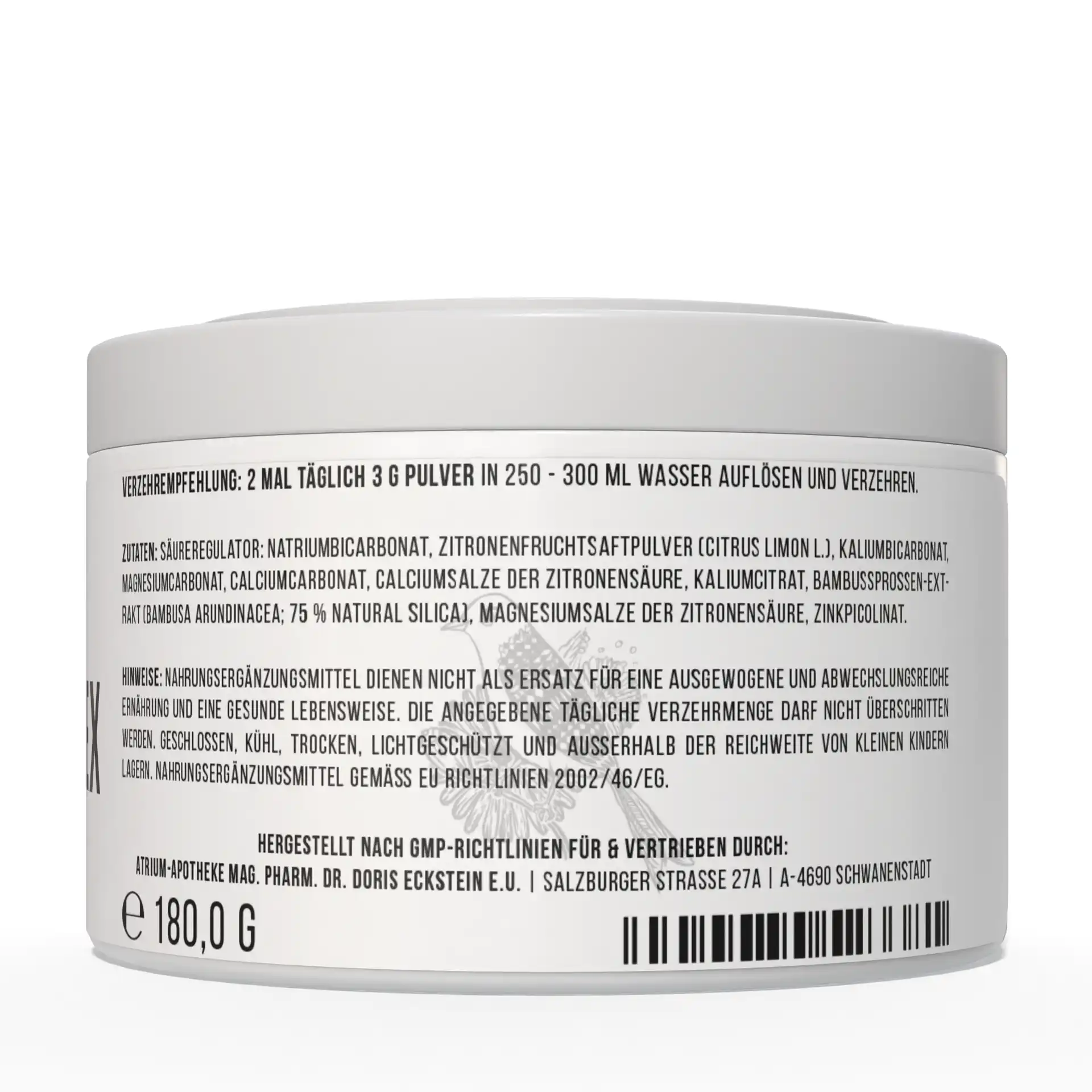Säureregulator: Natriumbicarbonat, Zitronenfruchtsaftpulver (Citrus limon L.), Kaliumbicarbonat, Magnesiumcarbonat, Calciumcarbonat, Calciumsalze der Zitronensäure, Kaliumcitrat, Bambussprossen-Extrakt (Bambusa arundinacea; 75 % Natural Silica), Magnesiumsalze der Zitronensäure, Zinkpicolinat.