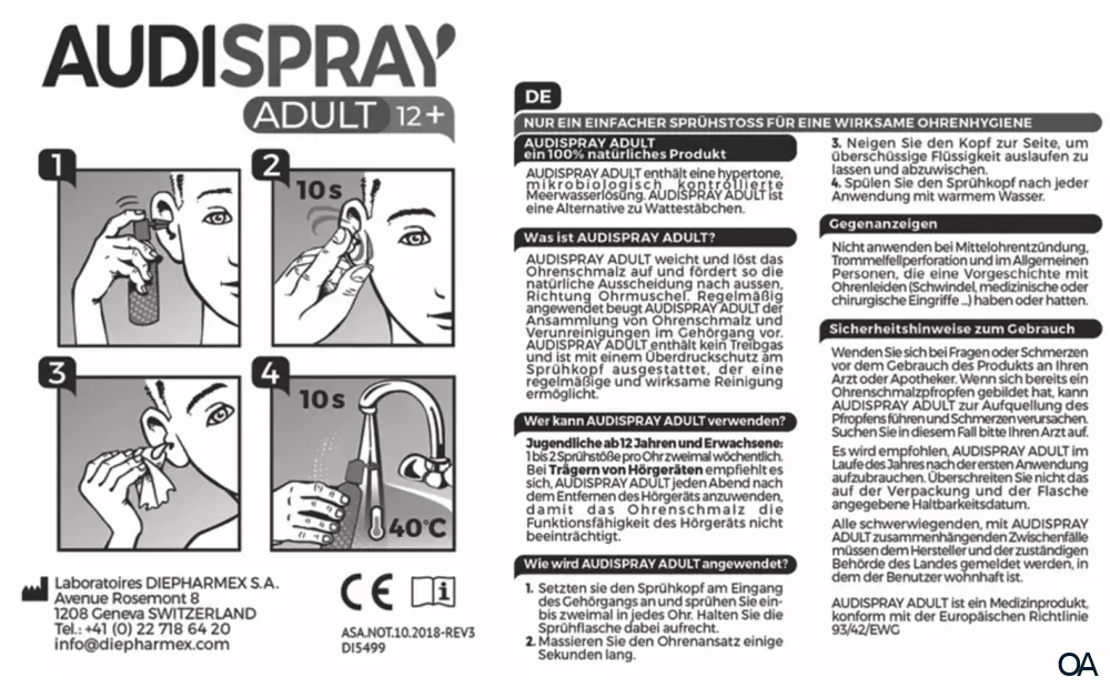 - Bei regelmäßiger Anwendung gewährleistet Audispray Adult eine perfekte Ohrenhygiene und vermeidet die Bildung von Ohrenschmalzpfropfen.