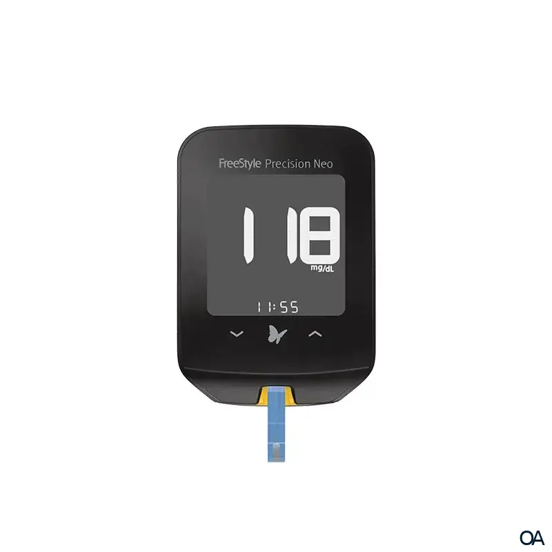 Das FreeStyle Precision Neo Blutzucker- und Ketonmessgerät ist ein In-vitro-Medizinprodukt zur automatischen quantitativen Messung des Blutzuckers und der β-Ketone (β-Hydroxybutyrat) im Blut. Das System besteht aus dem Messgerät und den Teststreifen und eignet sich für Selbsttests, einschließlich Selbsttests, die durch Betreuungspersonen durchgeführt werden, sowie den professionellen Einsatz als Hilfsmittel bei der Überwachung von Diabetes mellitus und Ketose einschließlich diabetischer Ketoazidose (DKA). Mit diesem System kann medizinisches Fachpersonal die Blutzucker- und Ketonwerte von Patient:innen überprüfen. Die Proben für die Blutzuckermessung müssen aus kapillaren (Entnahme an der Fingerbeere) Vollblutproben und Keton in kapillaren (Entnahme an der Fingerbeere) oder venösen Vollblutproben stammen. Das Messgerät darf nur zusammen mit FreeStyle Precision Blutzucker Teststreifen und FreeStyle Precision Blut-β-Ketonteststreifen verwendet werden. Das System sollte nicht zur Diagnose von Diabetes mellitus oder diabetischer Ketoazidose (DKA) verwendet werden. Das System ist nur für den Einsatz außerhalb des Körpers geeignet.